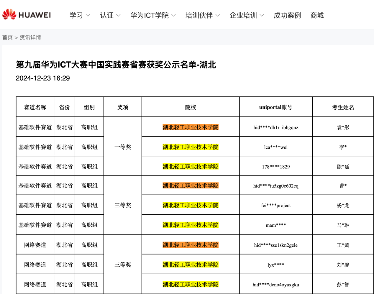 (信息工程学院 刘震讯)第九届华为ICT大赛中国实践赛省赛于2024年12月23日正式公布参赛结果,最终我校信息工程学院选派的三支代表队在基础软件赛道中获得省赛一等奖和三等奖,在网络赛道获得省赛三等奖。