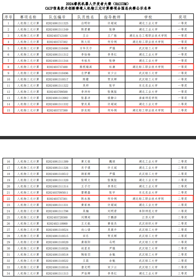(信息工程学院 杜康讯)在刚刚落幕的2024睿抗机器人开发者大赛(RAICOM)人机物三元计算赛项全国总决赛中,由我校信息工程学院何伶俐、杜康老师指导的23电子信息技术专业熊祝瑞淇、23电子信息技术专业陈火旺、彭友刚、陈永胜4名参赛学生表现卓越,勇夺全国一等奖2项,二等奖2项,充分展示了我院在信息技术领域的教学成果和学生的实践能力。
