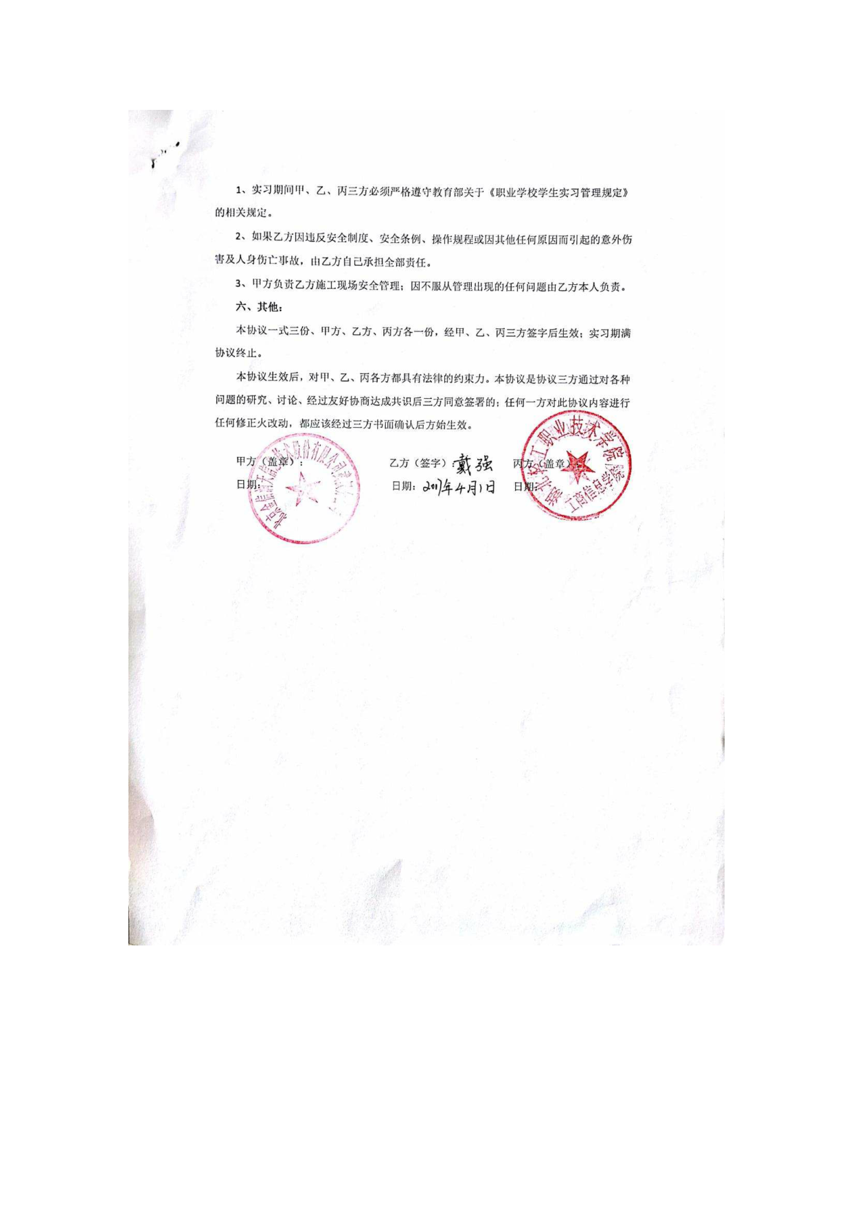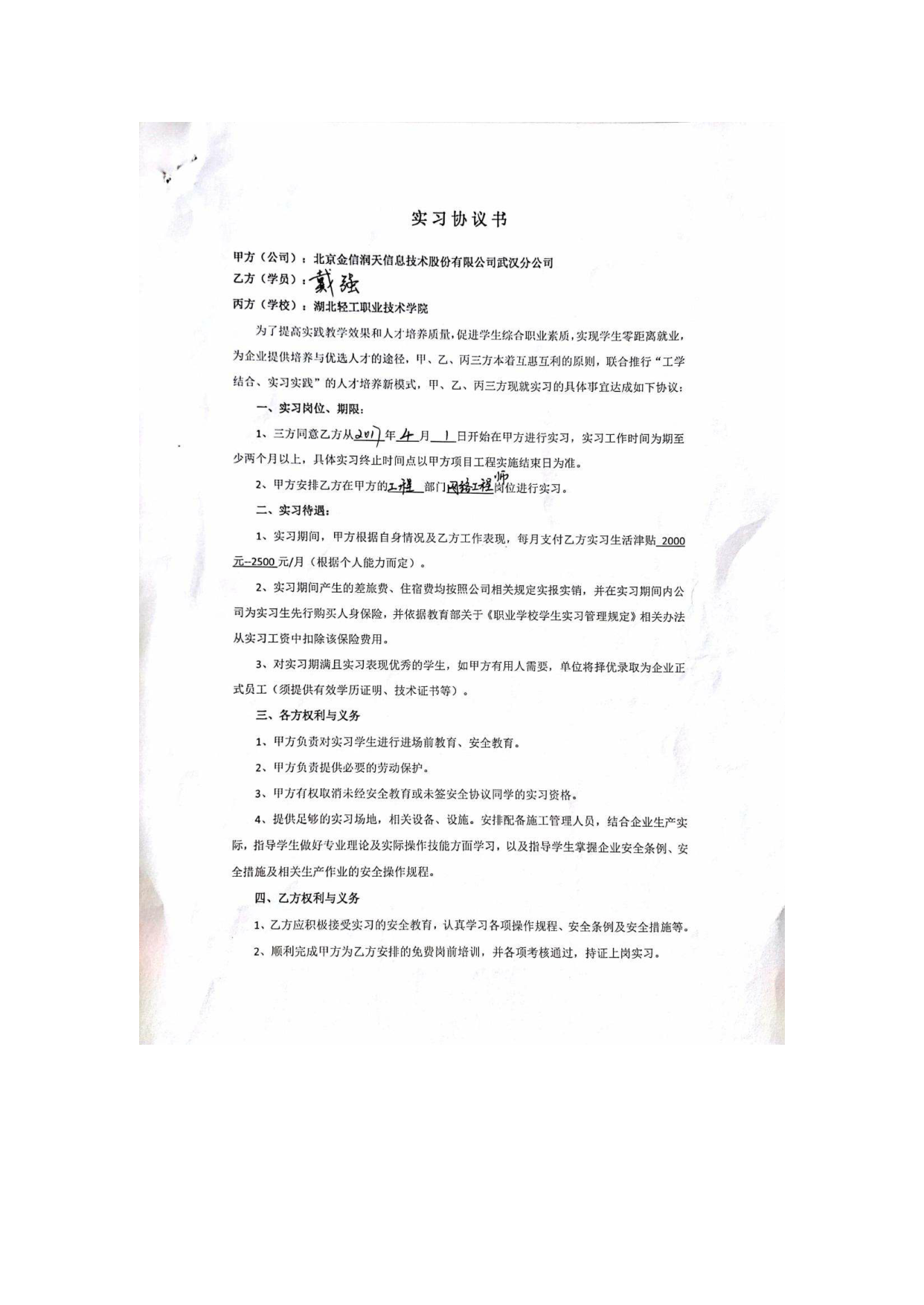 实习协议书—2017年北京金信润天信息技术股份有限公司武汉分公司