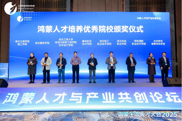 本次大会聚焦鸿蒙生态产教融合、人才与产业共创等核心方向,汇聚全国高校、头部企业及行业专家资源。在“鸿蒙人才与产业共创论坛”中,我校被授予“鸿蒙人才培养优秀院校”称号,杨健老师作为院校代表上台接受表彰。这一荣誉是对我校在鸿蒙生态人才培养、产教融合实践等方面工作的肯定——近年来,我校积极对接鸿蒙生态产业需求,推动课程体系与鸿蒙技术标准衔接,联合企业开展实践教学、项目孵化,积极为行业输送懂技术、能落地的应用型人才。