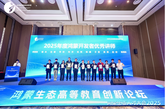 随后在“鸿蒙生态高等教育创新论坛”环节,杨健、赵欣两位老师凭借在鸿蒙技术教学与人才培养中的深耕实践,成功入选“2025年度鸿蒙开发者优秀讲师”,与全国优秀讲师代表共同登台领奖,其教学成果得到行业与生态伙伴的高度认可。