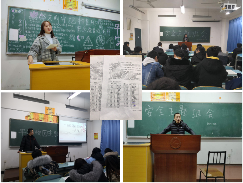 班会形式多样,18会计一班、二班结合“安全主题黑板报”的形式,让同学们在制作中加深印象,18会计三班、四班、计管班、计算机网络班、市场营销班通过老师PPT讲解、同学发表看法的形式敲响警钟,会后所有班级均开展了“平安校园 你我同行”签名活动。