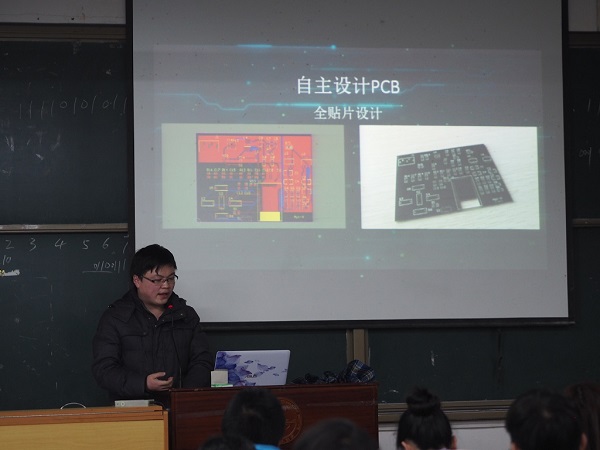 此次大赛作品不仅质量高,作品设计水平也是历届比赛中最高的,作品中不仅有手工打造的全金属机器人履带车、也有从PCB设计到程序设计全部由参赛选手包办的五彩音阶UV灯,还有结合了物联网概念的智能衣架、智能浇花系统,利用环保概念设计的可乐音箱。比赛过程跌宕起伏,选手们的作品不断地得到评委们和观赛同学们的好评。最后,15电信方亮同学的作品“APT-X无损音乐播放器”凭借优秀的创意、完整的设计以及完美的演示获得了一等奖。