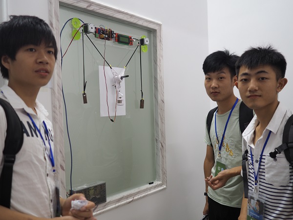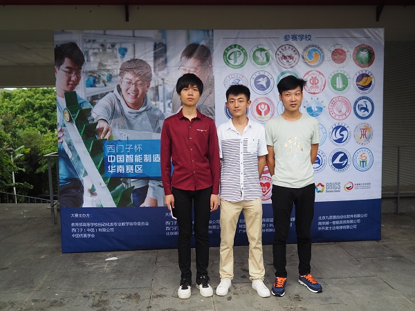 7月19日,同样由赵欣老师带队,15电子信息专业高行、李好、龚胜宇三位同学来到东莞,参加2017年西门子杯中国智能制造挑战赛智能创新研发赛项比赛。,此项比赛是由教育部与西门子有限公司签订的战略合作框架下的一项国家级赛事,由教育部高等学校自动化类专业教学指导委员会、西门子有限公司和中国仿真学会联合主办。大赛的方向涉及智能制造领域中的科技创新、产品研发、工程设计和智能应用等。此次智能创新研发赛项吸引了华中科技大学、广西大学、武汉理工大学等大量本科院校参赛,最终经过三天三轮评比,我院代表队的“智能绘画机器人”荣获了华南赛区二等奖,参赛作品获得了好评。