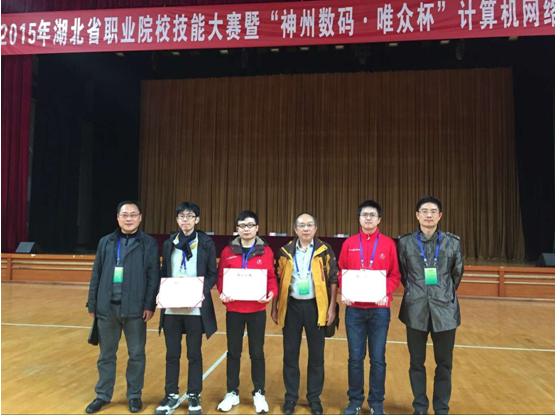 2015年11月21日,2015年湖北省职业院校技能大赛高职高专组“神州数码,唯众杯”计算机网络应用比赛在武汉软件工程职业学院举行。我院13计管肖昀博同学和13网络覃铭、李旭同学组队代表我院参赛,经过激烈角逐,我院代表队在众多强手中脱颖而出,以总分第三的成绩获得一等奖。同时指导教师戴远泉、程宁、邱文军获得优秀指导教师。