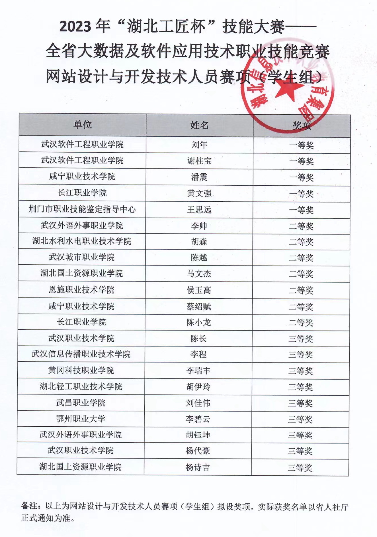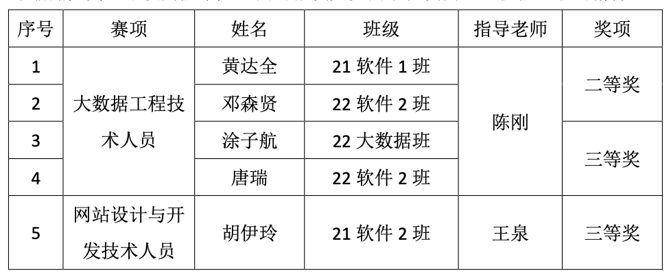 我院教师陈刚老师指导的由黄达全(21软件1班)和邓森贤(22软件2班)组成的队伍获得大数据工程技术人员赛项二等奖、另一只对由涂子航(22大数据班)和唐瑞(22软件2班)组成的队伍获得大数据工程技术人员赛项三等奖的好成绩。我院教师王泉老师指导的胡伊玲(21软件2班)获得网站设计与开发技术人员个人赛项的三等奖好成绩。