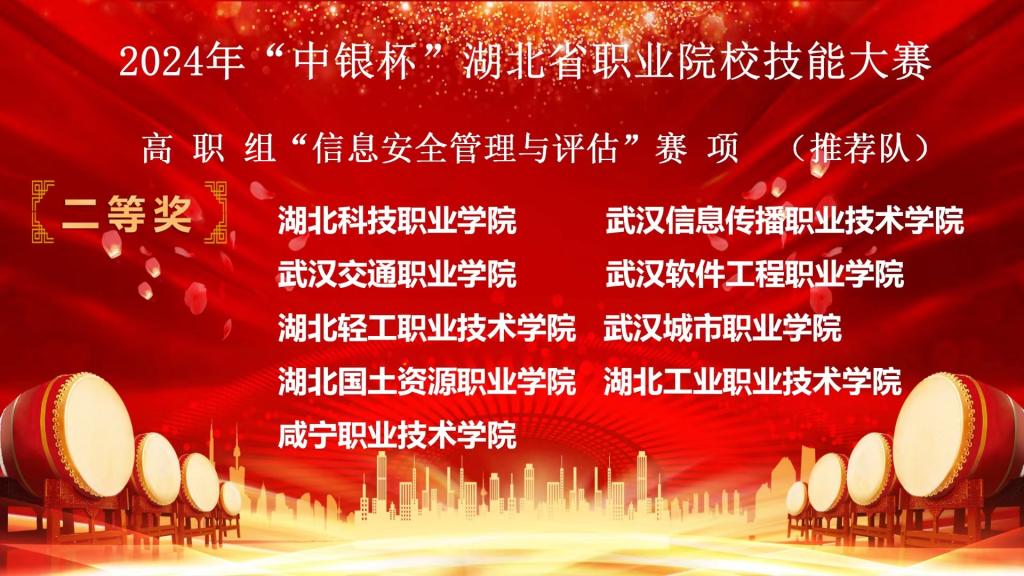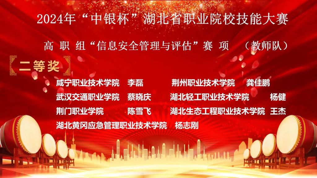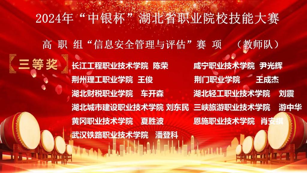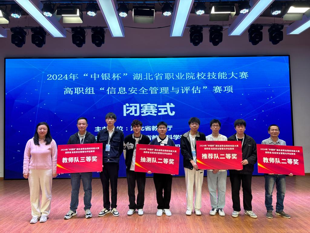 (信息工程学院 杨健讯)3月23日,2024年“中银杯”湖北省职业院校技能大赛(高职组)信息安全管理与评估赛项在湖北生物科技职业学院落下帷幕。经过四天的激烈比拼,在学生团体赛中,由信息工程学院2022级学生陈速延、奚家文、石涛组成的推荐队,周运威、吴章景、蔡恒组成的抽测队均获二等奖。在教师个人全能赛中,信息工程学院杨健老师获教师队二等奖,刘震老师获教师队三等奖的好成绩。