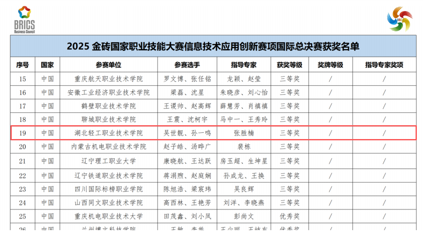 (信息工程学院 张胜楠讯)2025金砖国家职业技能大赛信息技术应用创新赛项国际总决赛于2026年3月27日至29日在许昌职业技术学院圆满落幕。由我院张胜楠老师带领24计网4班吴世靓和24软件1班孙一鸣两位同学前往参赛,并最终荣获国际总决赛三等奖。
