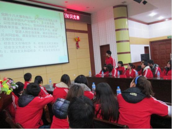 经过激烈的预赛,共有6支队伍进入决赛。活动一开始,就以新颖的入场方式吸引住了观众的眼球,各参赛队伍都录制了各有特色的VCR展现班级风采,并以横幅的形式打出各班的口号,把现场气氛拉向高潮。比赛环节分别是初试锋芒,小试牛刀,分秒必争,轻松一刻,勇往直前,登峰造极这六个环节。比赛内容涵盖了简答题、选择题、判断题以及图片题等多式多样的题目类型。在各个环节中,选手们都认真从容地答题,面对一个一个问题与挑战,保持着清晰的头脑、发挥着最佳的水平,选手们充分展现了个人的才华,也让在场的观众对党团的知识有了进一步的了解。现场的工作也井然有序的进行着,使得活动最后取得圆满结束!