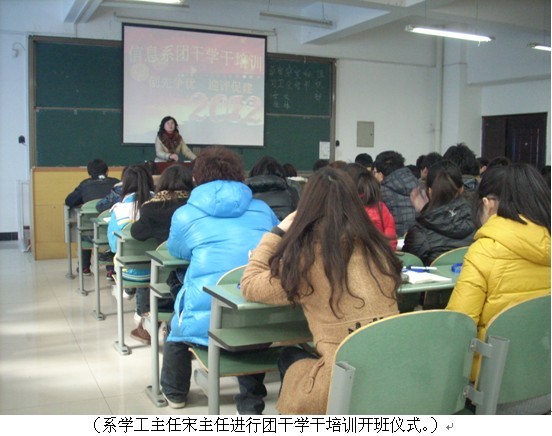 首先由信息系学工主任宋老师对此次团干学干培训进行开讲仪式,之后几天分别由信息工程系张首杰主任、宋虹主任为全体学生会及11级各班班干部进行培训,最后一天则由我系团总支书记胡筠对学生会各个部门的职能进行的讲解,同时与大家互相交流的工作经验。