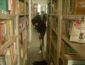 这一群人正是我院信息工程系十四期重培对象和十六期入党积极分子。他们都手拿工具,整齐的站好,分成三组。一组负责C区四楼的会议室,一组负责打扫学术报告厅,只见他们认真地擦拭着桌椅,清扫地面。大家都认真的配合,做好每一个角落。另一组负责打扫图书馆,他们同样是用认真的态度,每一个书架都被擦的干干净净,每个人脸上都洋溢着愉快满足的神情。