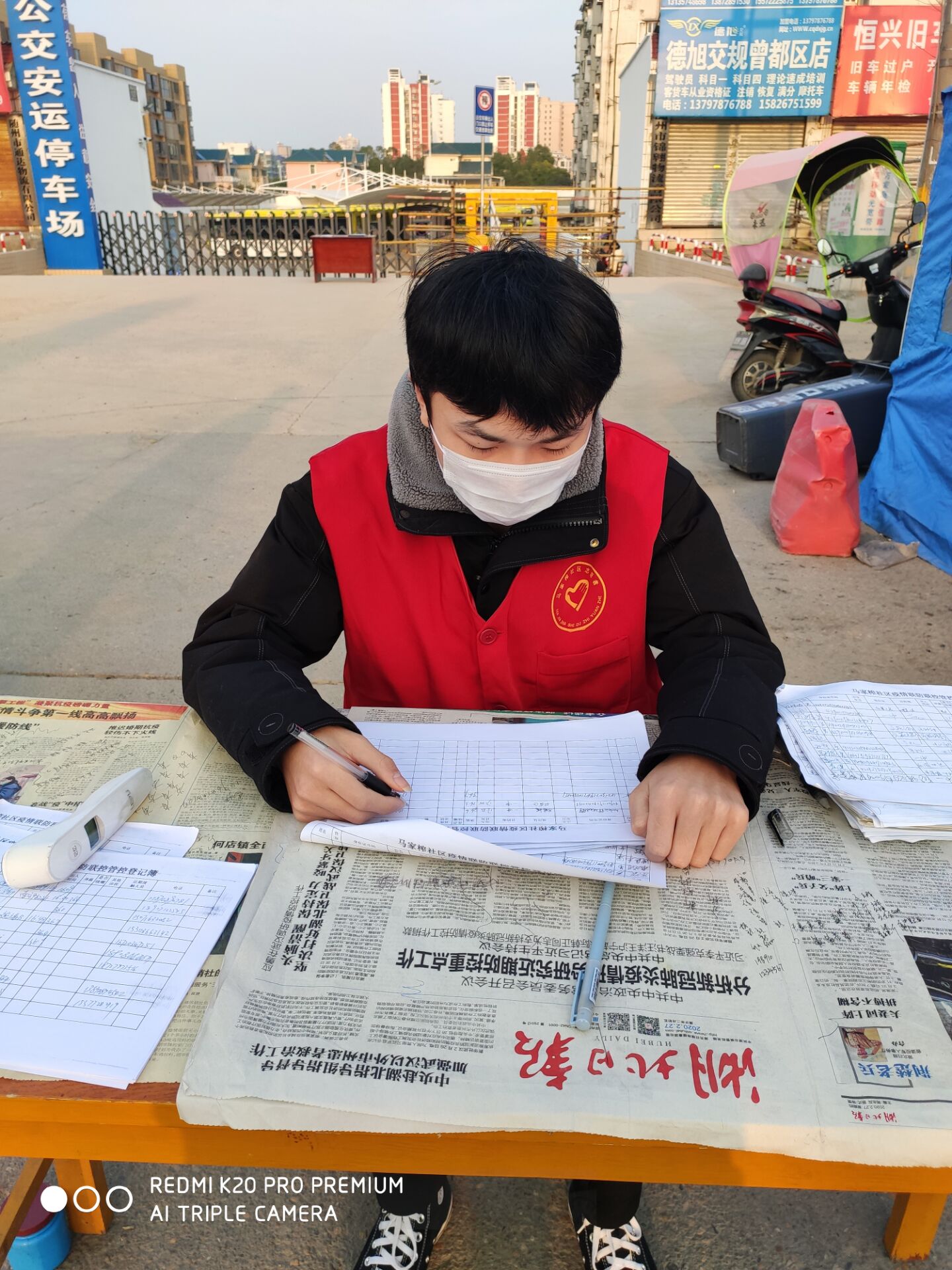 徐煜倬同学的家乡在美丽的编钟城市湖北随州,他的母亲是马家榨社区的一名工作人员,受母亲影响,从1月9日放寒假回到随州,他便同母亲一起奋战在社区志愿工作的前线。前期,在主干道路缓解交通拥堵是他的首要责任,他每天坚守在岗位前,疏导指挥人群过马路,保障着每一位出行者的安全。1月底疫情爆发以来,响应政府号召,徐煜倬和母亲一起在马家榨社区统计、核查人员信息。每天挨家挨户排查回乡人员信息,监测体温,以及宣传疫情期间的各项注意事项。