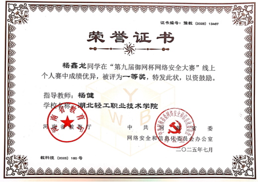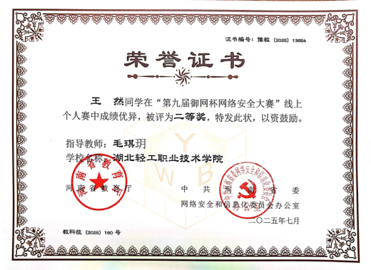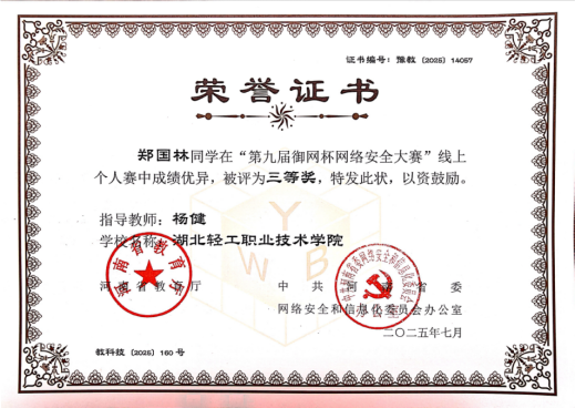 (信息工程学院 毛琪玥讯)近日,第九届 “御网杯” 网络安全大赛圆满落幕,参赛结果正式揭晓。我校学子经过激烈竞争,凭借不懈的努力与扎实的专业知识,最终斩获佳绩。其中,由杨健老师指导的杨鑫龙同学荣获线上赛一等奖、郑国林同学荣获线上赛三等奖,由毛琪玥老师指导的王然同学荣获线上赛二等奖。