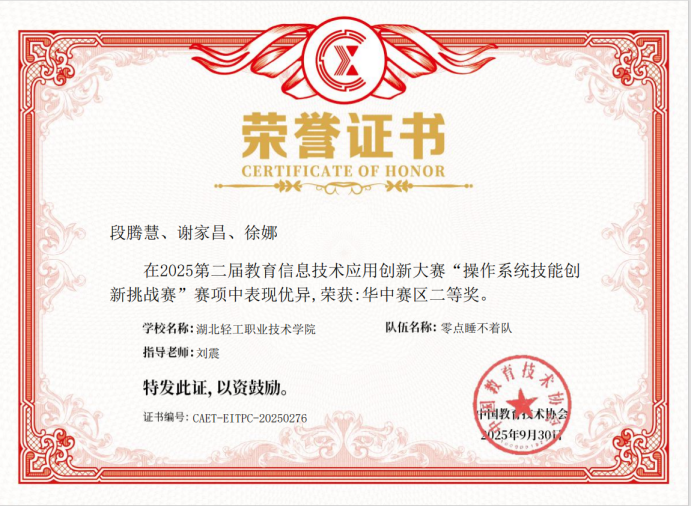 (信息工程学院 刘震讯)2025年10月15日,第二届教育信息技术应用创新大赛“操作系统技能创新挑战赛”结果揭晓,信息工程学院代表队24云计算1班段腾慧、24计网2班谢家昌、24云计算1班徐娜三位同学凭借出色的表现,荣获华中赛区二等奖。