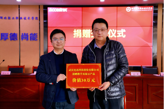 (信息工程工程学院 何伶俐讯)1月14日,武汉光迅科技股份有限公司向湖北轻工职业技术学院捐赠一批光通信产品,捐赠仪式在学校六楼会议室举行。光迅科技供应链管理部副总经理刘军、运作管理部经理余强、人力资源专员郭耀中、人力资源实习生李宛姿(23级集成电路技术班学生),湖北轻工职业技术学院党委副书记、院长夏光蔚,信息工程学院牵头负责人赵欣、副书记王毅,集成电路教研室主任何伶俐、专业带头人于海燕及专任教师代表杜康、徐梦龙、苏小默等参加了此次活动。