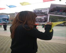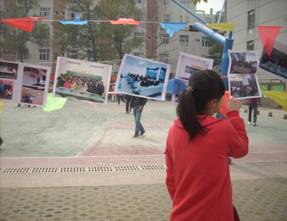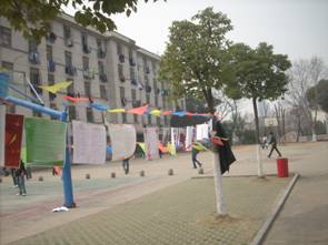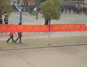 在篮球场一侧,挂起了信息系各个班级的争先创优倡议书及在班级中拍摄的照片,和宣传横幅。在各张倡议书上各个班级都表明了自己班级为以后制定的计划,对未来的展望,表达了对往后学习生活的良好寄托,在照片上各个班级都用自己风格自己特色的方式拍摄的照片,用一张张微笑并坚定的面孔表达了自己的决心。