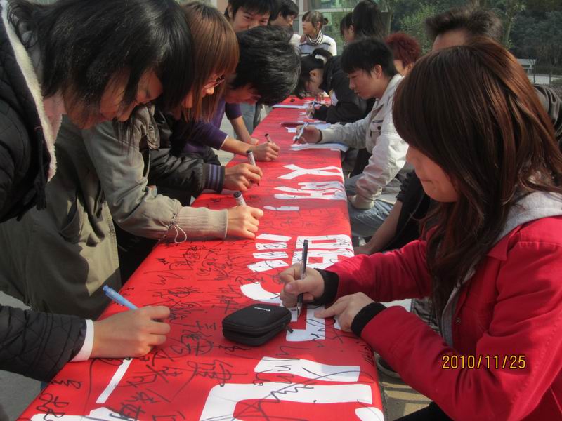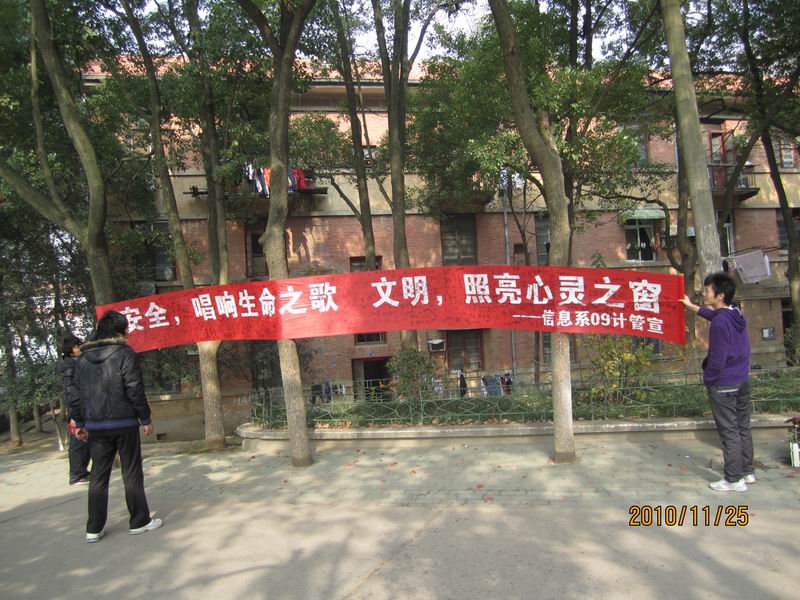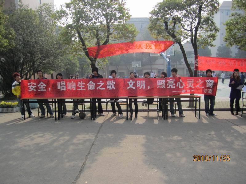 2010年11月25日星期四 信息工程系09计管班在院篮球场举行了关于安全文明月“安全--唱响生命之歌,文明--照亮心灵之窗”的签名活动。
