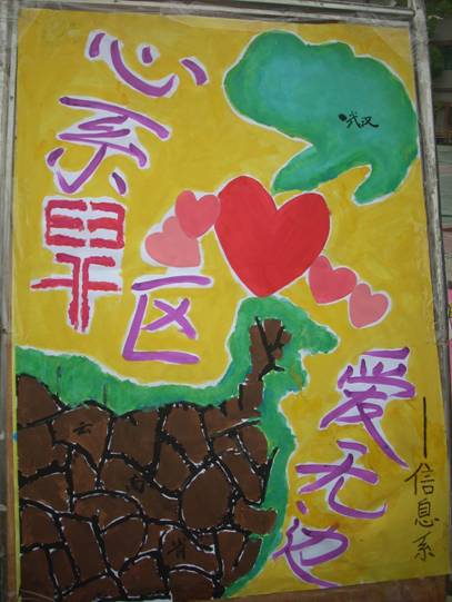 近日来,我国西南地区遭遇六十年不遇的特大旱灾,此次旱情范围之广,历时之长,程度之深,都是历史同期少有的,为响应国家抗旱救灾的号召,信息工程系开展了以“心系旱区,爱无边”为主题的首届手抄报比赛。