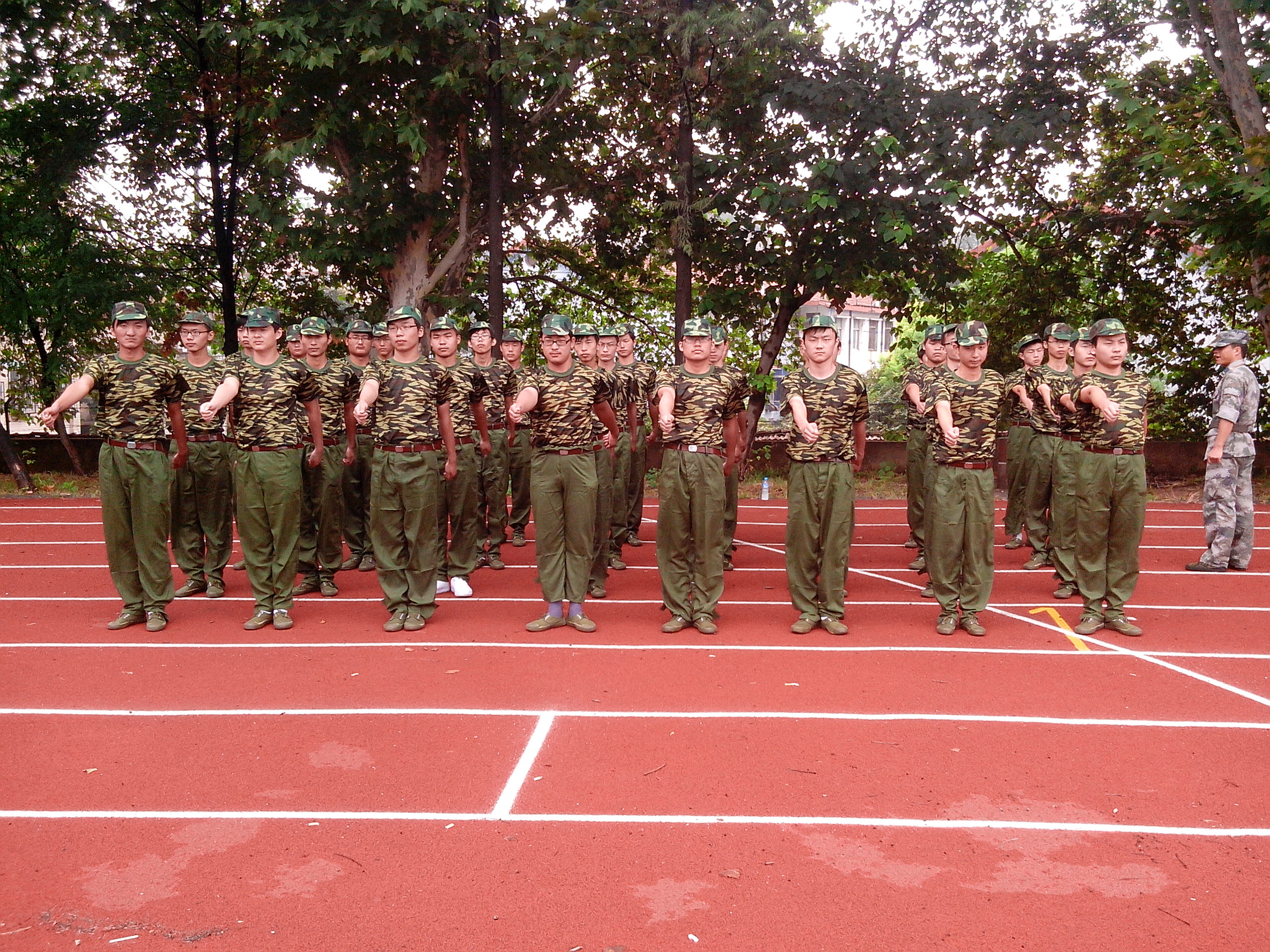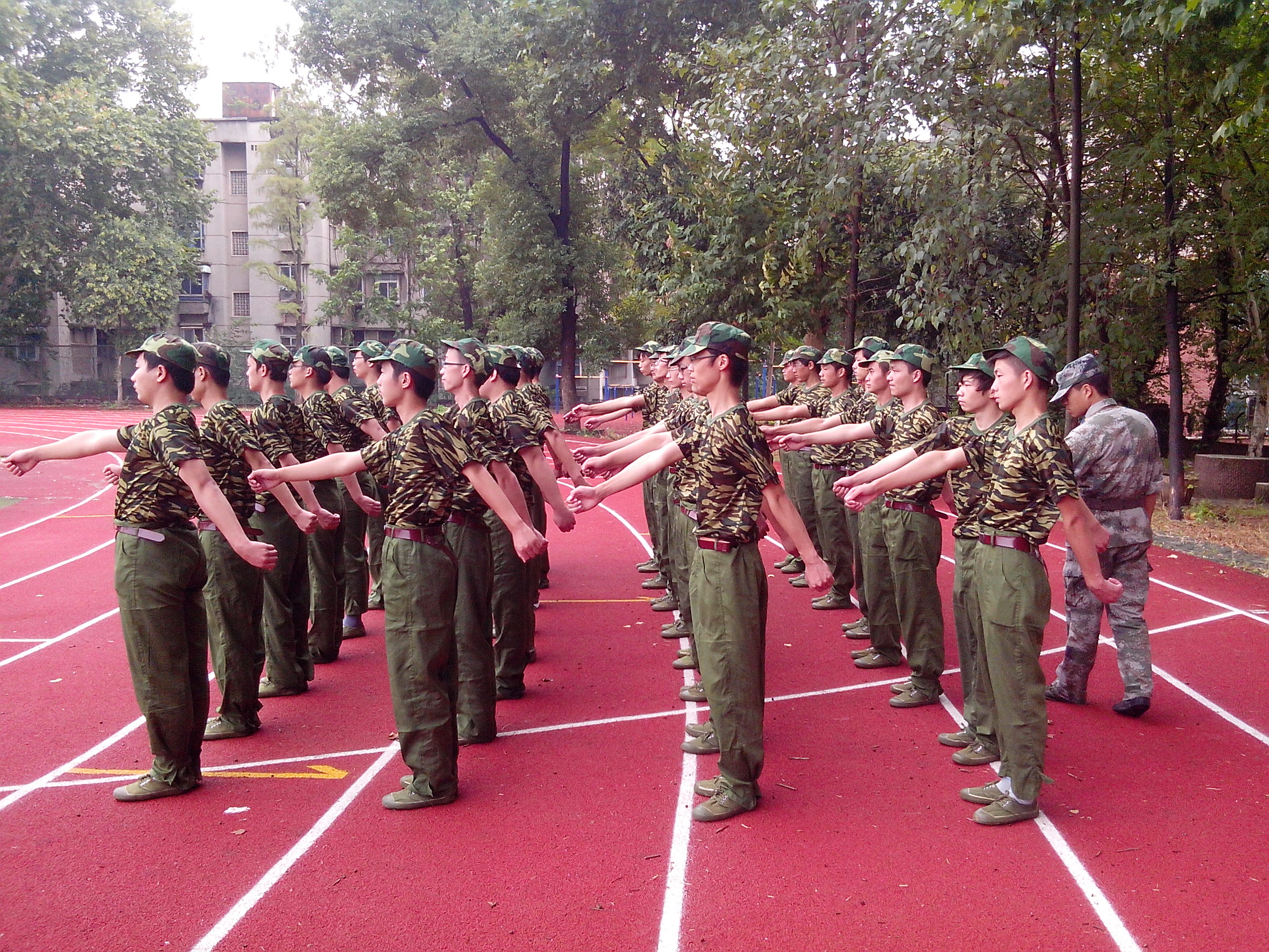 在军训场上,同学们那嘹亮的口号似乎要吞噬火辣的骄阳,炎炎热日也并未影响到同学们火热的激情。他们呐喊,吼出青春的张扬;他们呼啸,迸发出以校为荣为国争光的信心。他们借助这次短暂的军训,锤炼钢铁般的意志,铸造钢铁般的体魄。立正,稍息,站军姿,在教官一次次严格要求下一次次重复这一枯燥但又不失意义的动作,军训让他们更有力量及信心迎接未来的每一个挑战,虽然苦虽然累,但他们依然微笑着面对。