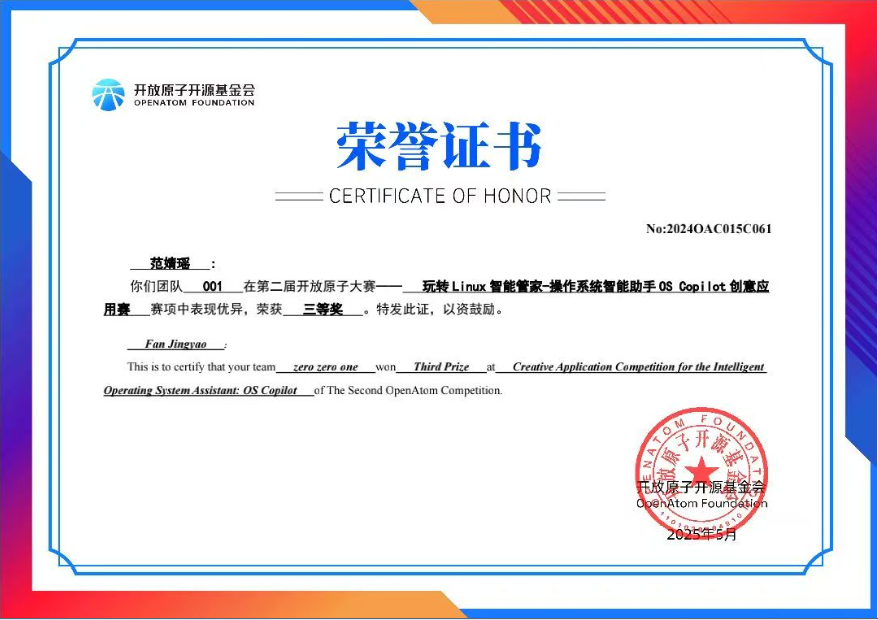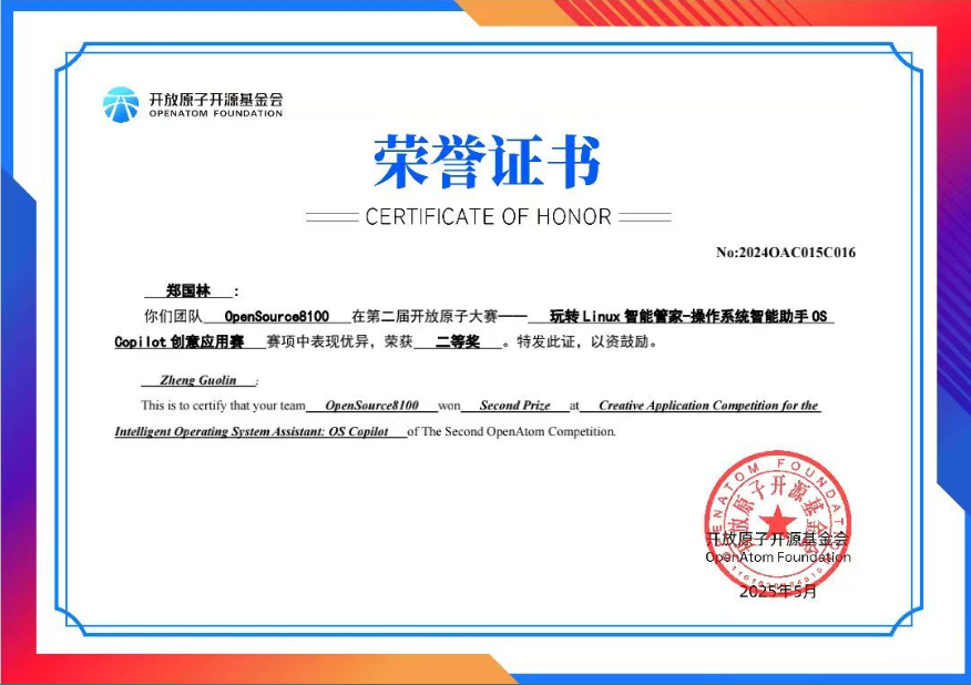 (信息工程学院 杨健讯)近日,第二届开放原子大赛-OS Copilot比赛收官,我校信息工程学院两支队伍脱颖而出,斩获佳绩。郑国林同学带领的 OpenSource8100战队荣获全国二等奖,范婧瑶同学带领的001战队获全国三等奖。此次大赛竞争激烈,吸引来自全国本科、高职院校千余支队伍报名参赛。