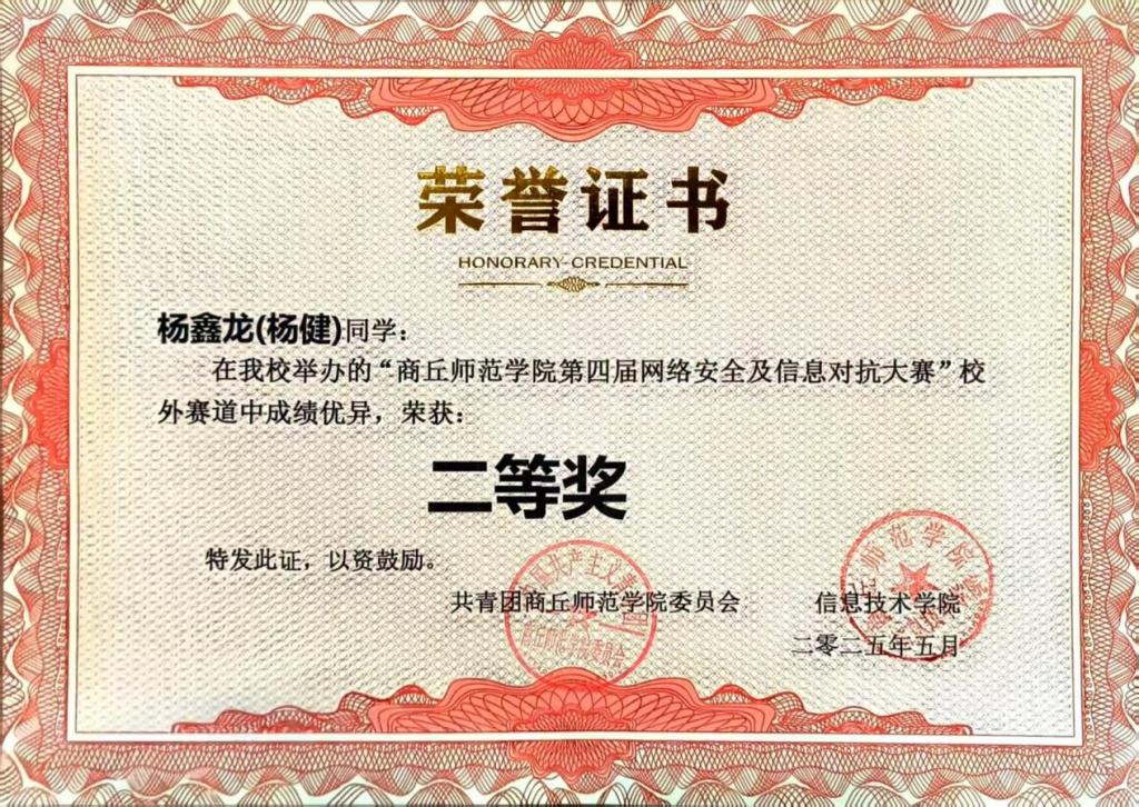 (信息工程学院 杨健讯)近日,第四届网络安全及信息对抗大赛圆满落幕,我院由杨健老师指导的杨鑫龙、郑国林两位同学在竞争激烈的校外赛道中表现优异,分别荣获二等奖和三等奖,充分展现了我院网络安全人才培养的显著成效。
